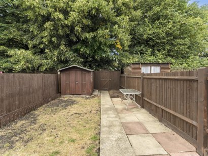 The rear of the property features a private garden, predominantly laid to lawn with a shed providing useful storage space for outdoor equipment.